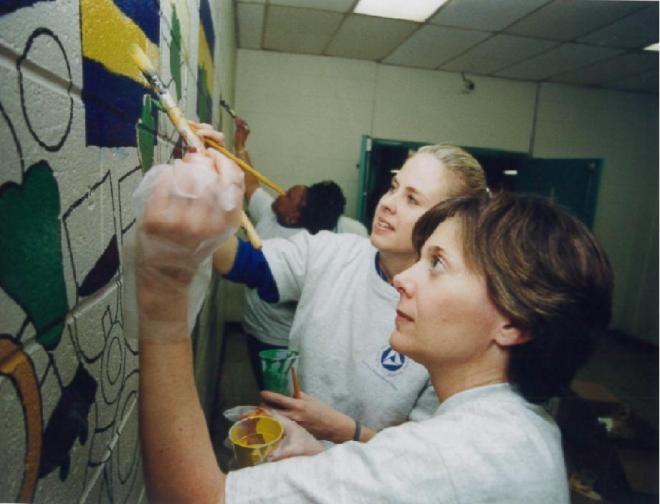 Way Back Wednesday! These volunteers work together to paint geometric shapes on the walls of a local school. A fresh mural is inspiring to blossoming minds!